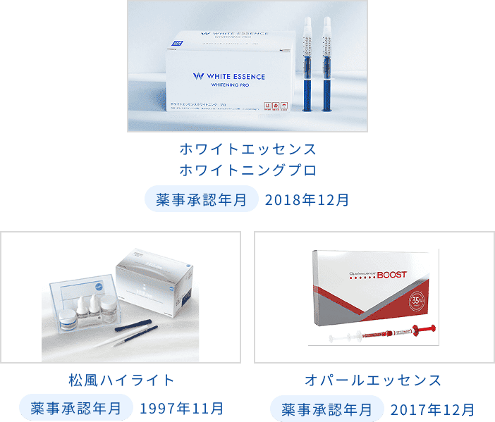 ホワイトエッセンスの薬剤は、すべて歯の内部(象牙質)から白くするものです。また、厚生労働省による薬事承認*3を得ています。
