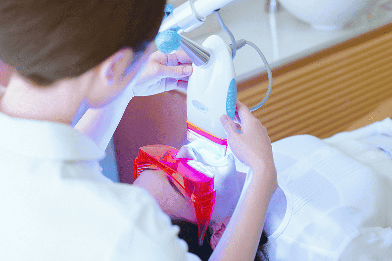 歯科医院で行うホワイトニング。専用の薬剤と照射機を使用し、歯の内部まで白くします。