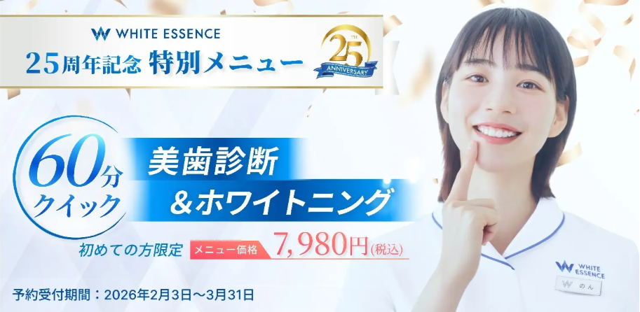 歯のホワイトニングや歯のクリーニングなどのサービス※1を全国337※2の加盟歯科医院で展開するホワイトエッセンス株式会社(代表取締役社長:入山 裕左 所在地:東京都渋谷区 以下「ホワイトエッセンス」)は、2026年で誕生25周年を迎えます。※3このたび、25周年を記念し、ホワイトエッセンスでの施術を未体験の方に、ホワイトエッセンスの「効果」と「快適さ」をご実感いただきたく、60分間のホワイトニングを7,980円(税込)で体験できる特別メニューをご用意いたしました。2026年2月3日(火)より2026年3月31日(火)までのご予約が対象の期間限定メニューです。