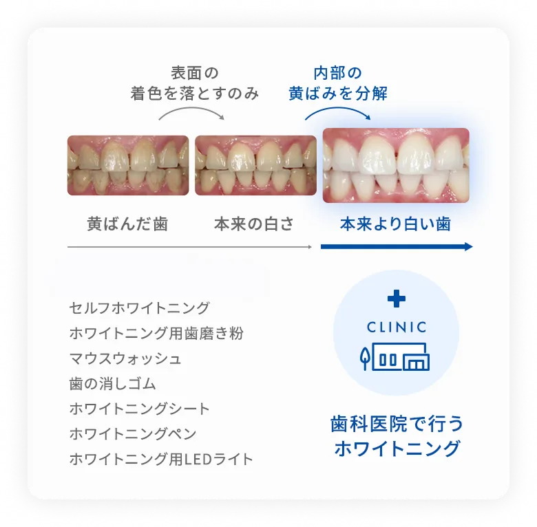 多くの人が知らない重要な事実があります。歯を削ることなく、「本来より白い歯」を実現できる方法は、実は歯科医院で行う医療ホワイトニングのみなのです。